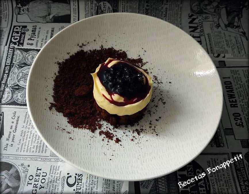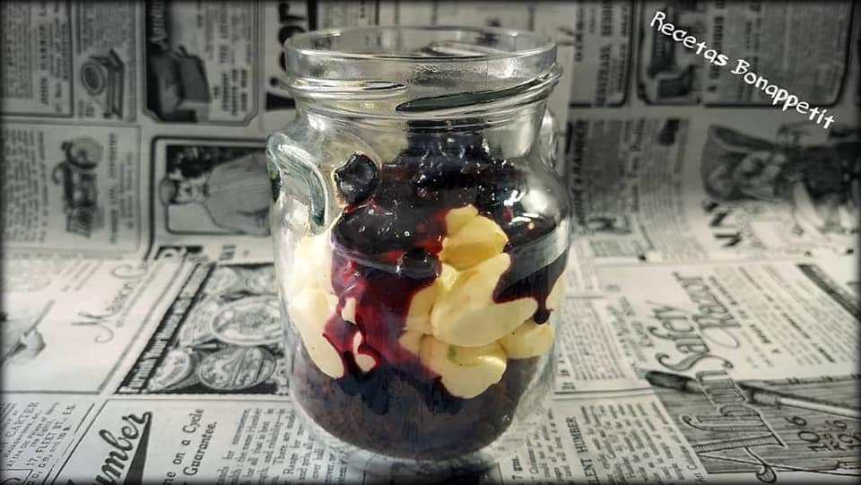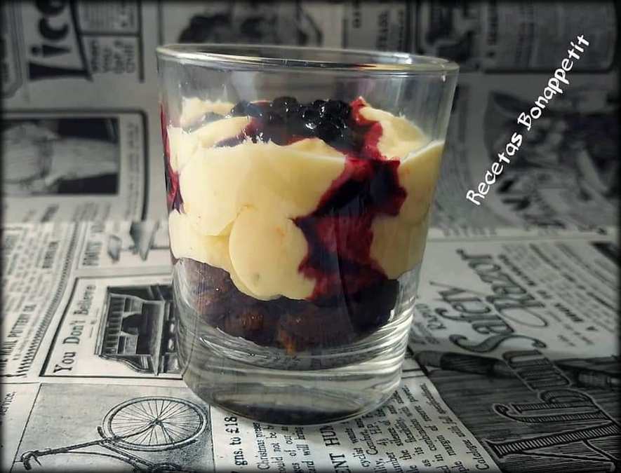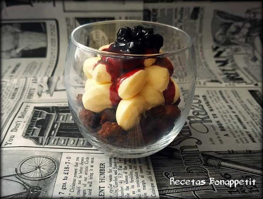 En una copa o en un vaso colocamos las galletas troceadas en su base, encima echamos la crema de queso y terminamos napando con la mermelada de frutos rojos.