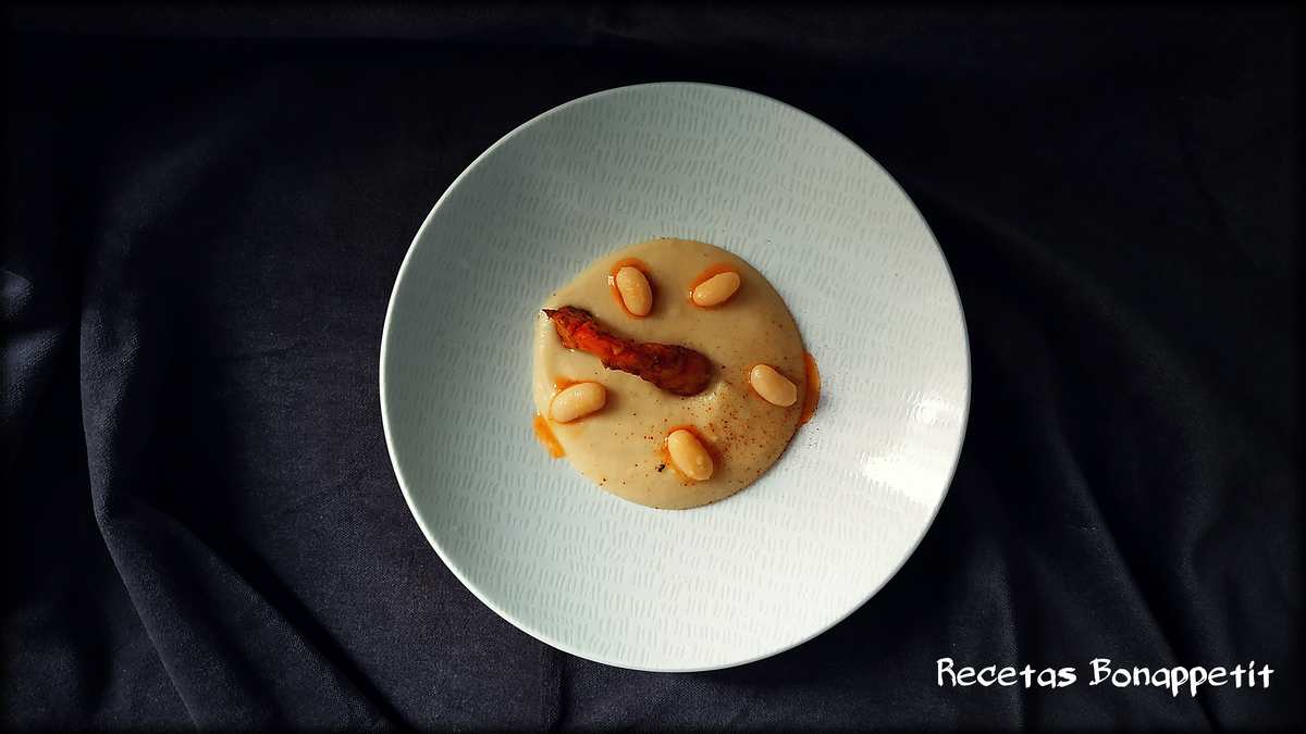 Trituramos las alubias, las pasamos por un chino o un colador, le añadimos un chorrito de nata y ponemos a punto de sal. Mezclamos bien y reservamos caliente. Si nos ha quedado muy espeso, podemos aligerar la crema con un poco de agua caliente.