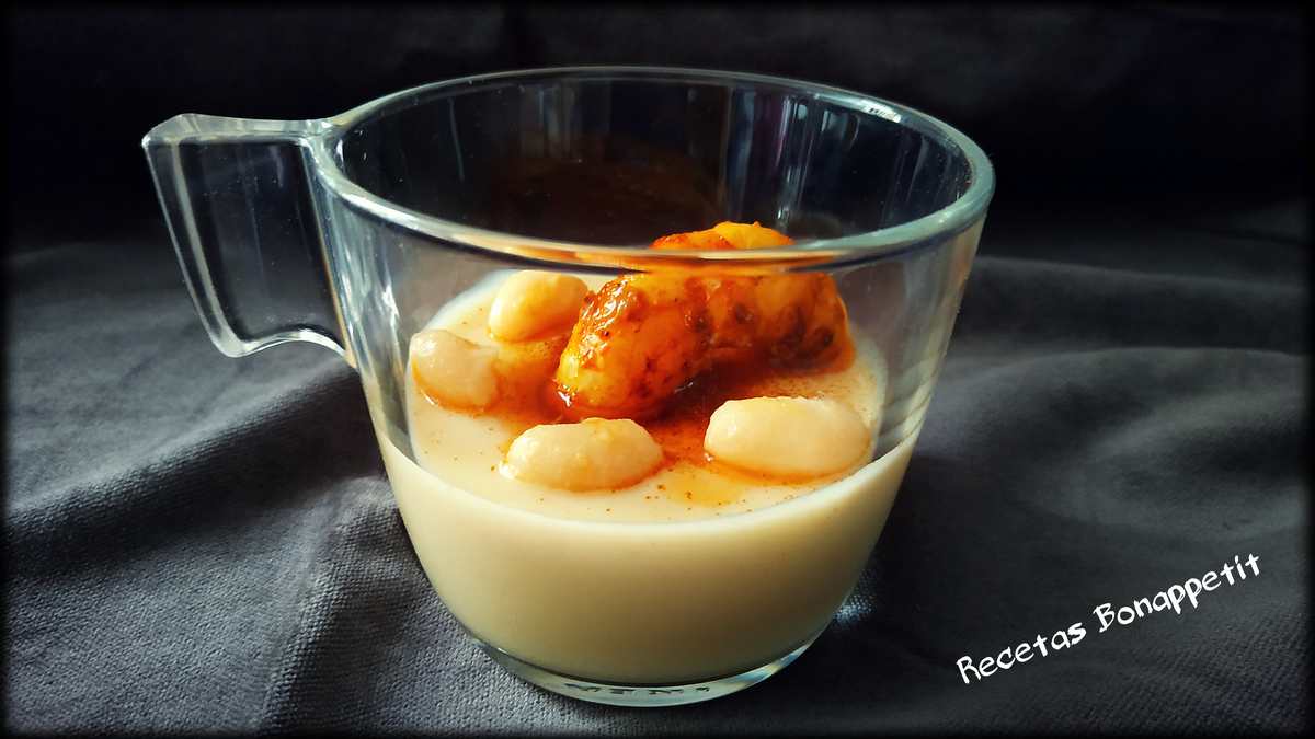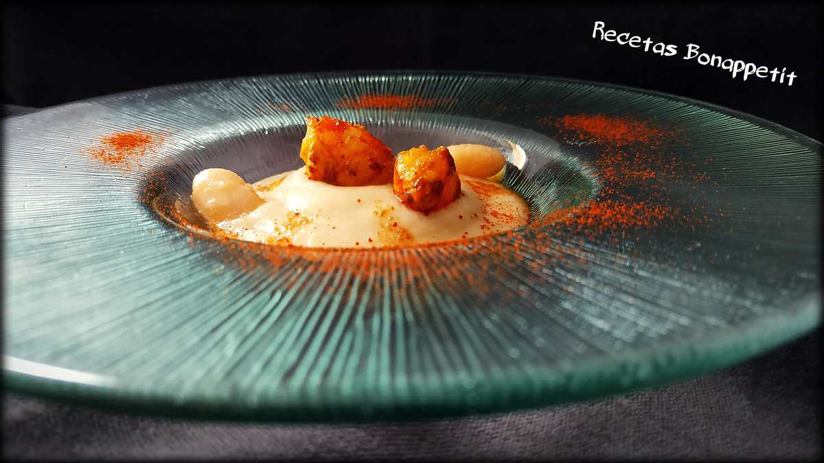 Sobre un plato hondo, vertemos la crema de alubias bien caliente, colocamos las gambas, echamos un poco del aceite de marisco y espolvoreamos con un poco de pimentón.