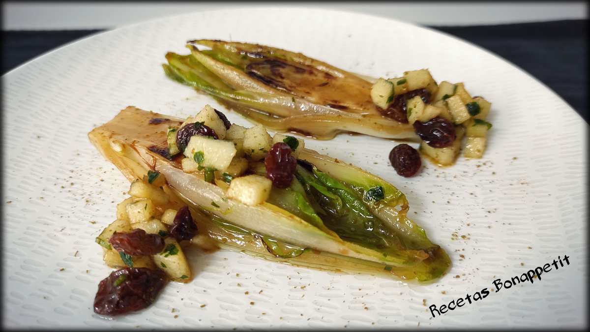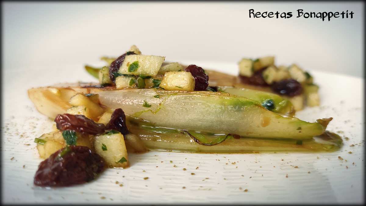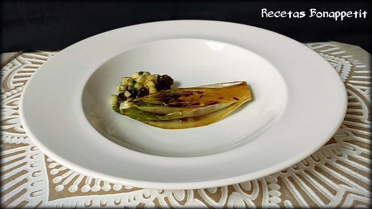 Sobre un plato colocamos las endibias, salseamos por encima con la vinagreta de manzana y terminamos espolvoreando cebollino picado.
