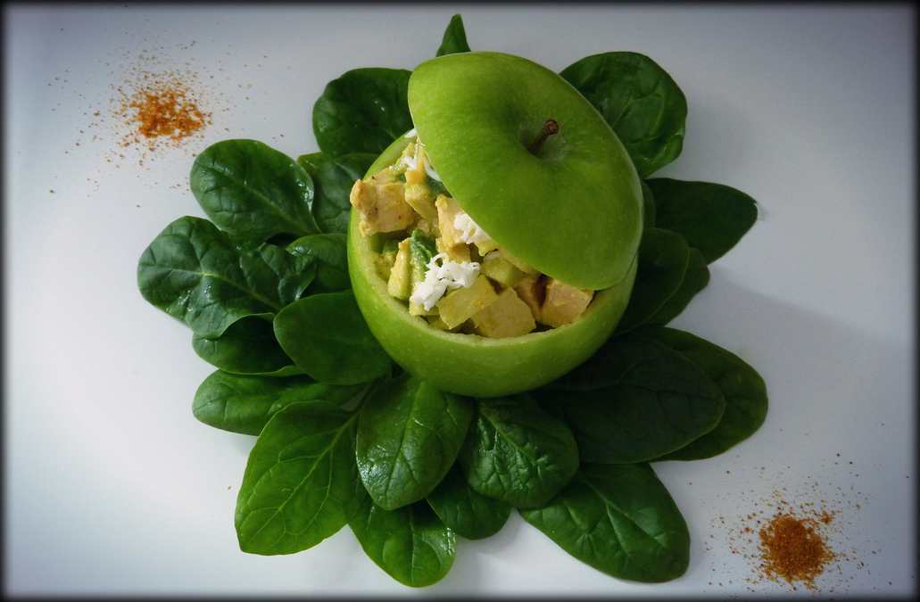 Rellenamos el interior de la manzana con parte de la mezcla del pollo, tapamos la manzana con la txapela y la colocamos encima de las hojas de espinacas.