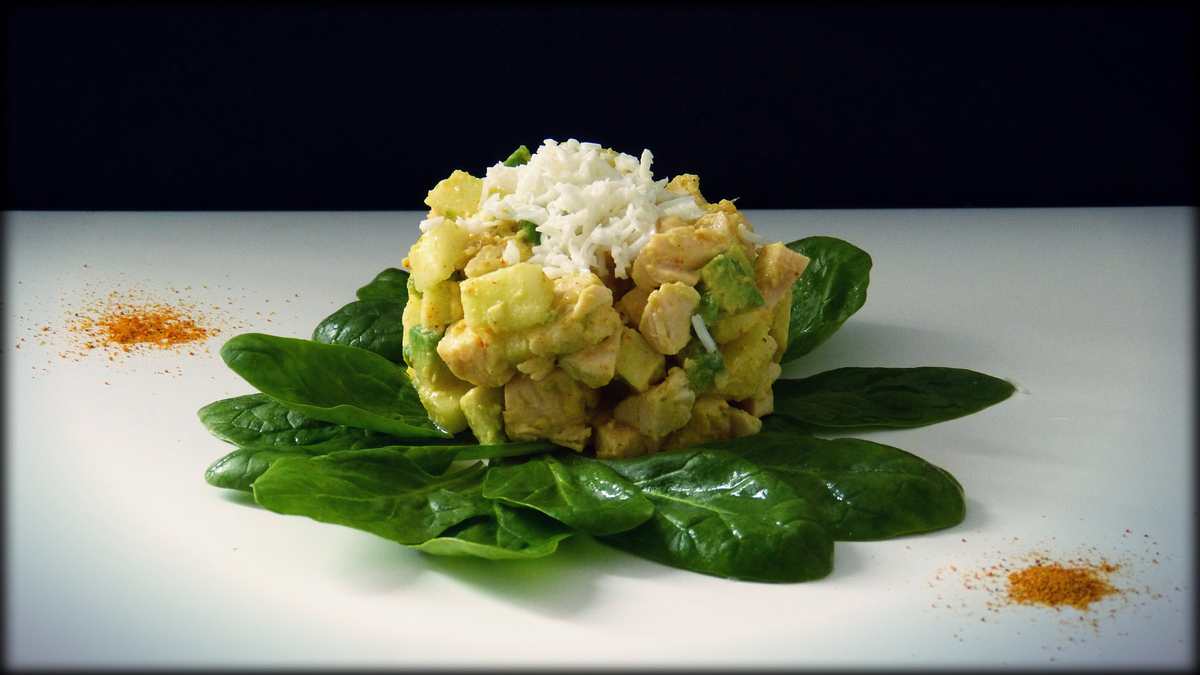 Cogemos una fuente y colocamos las hojas de espinaca, encima la mezcla del pollo y manzana, y echamos por encima la clara de huevo picada. Terminamos espolvoreando curry.