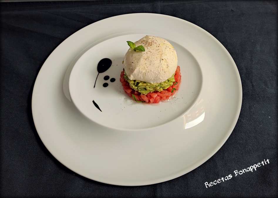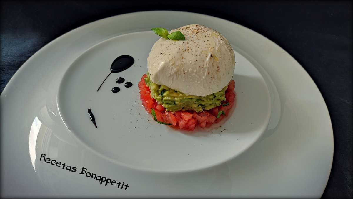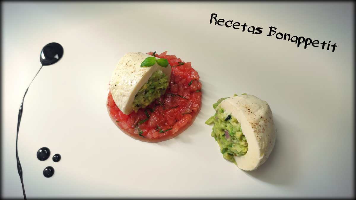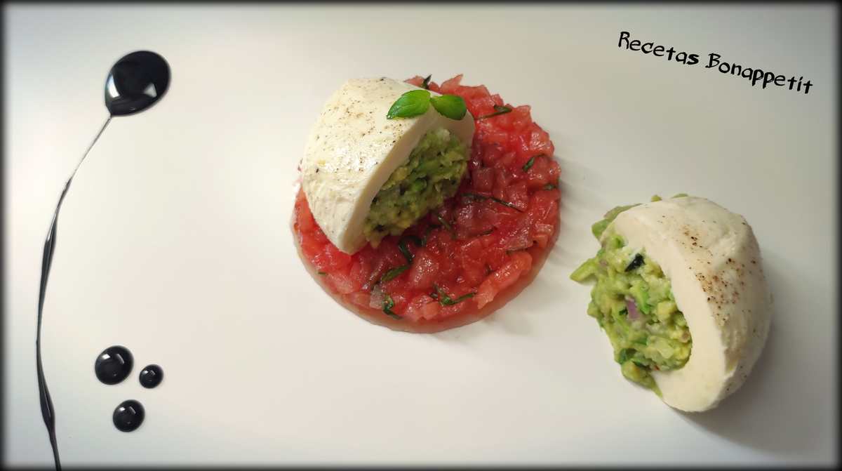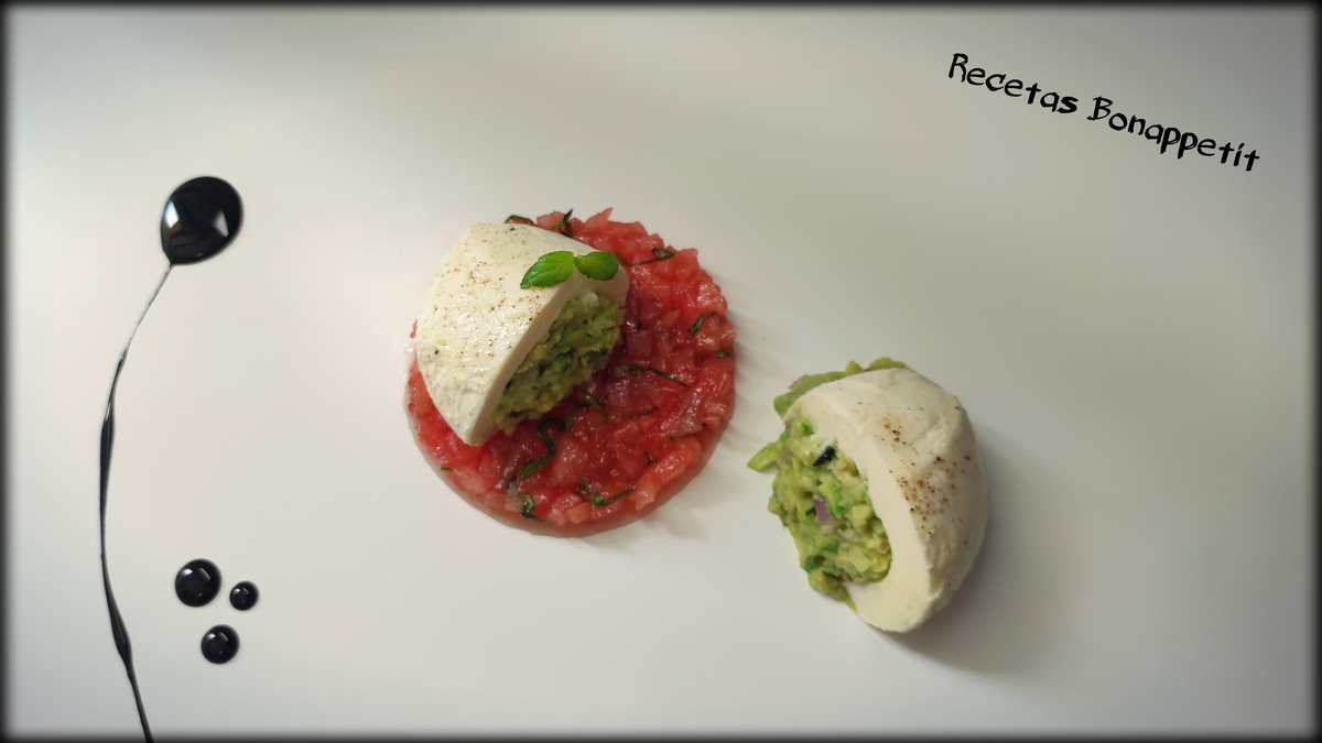 Sobre un plato ponemos el tartar de tomate y colocamos encima la mozzarella rellena, dándole la vuelta para que no se vea el guacamole. Salpimentamos y terminamos echando un chorrito de aceite de oliva por encima.