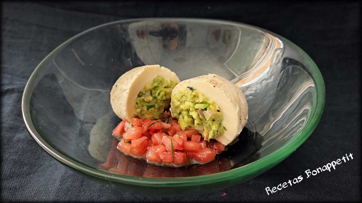 Para rellenar la mozzarella, escurrimos bien la mozzarella del suero y cortamos la parte superior de la mozzarella como si se tratara de una tapa. Vaciamos parte del interior con una cuchara y rellenamos con el guacamole.