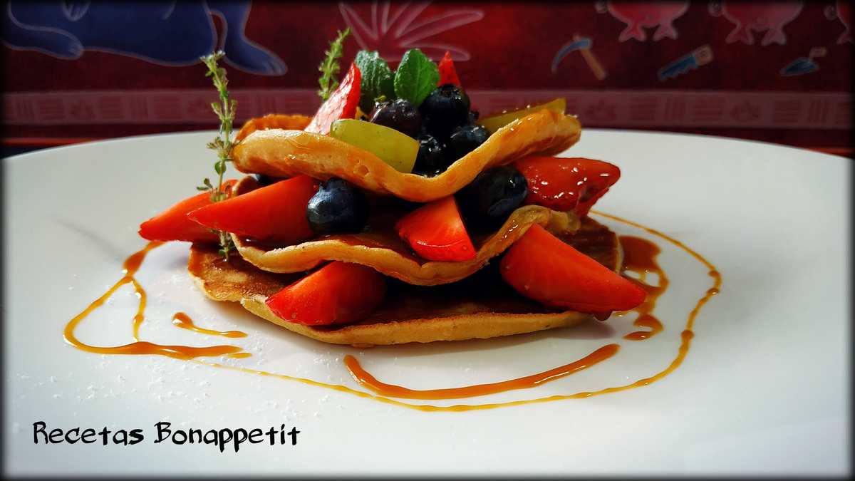 Sobre un plato colocamos un pancake, encima las frutas y salseamos con el toffee de coco. Por último ponemos otro pancake y añadimos más frutas. Vertemos el resto del toffee en una salsera y acompañamos los pancakes con ello.