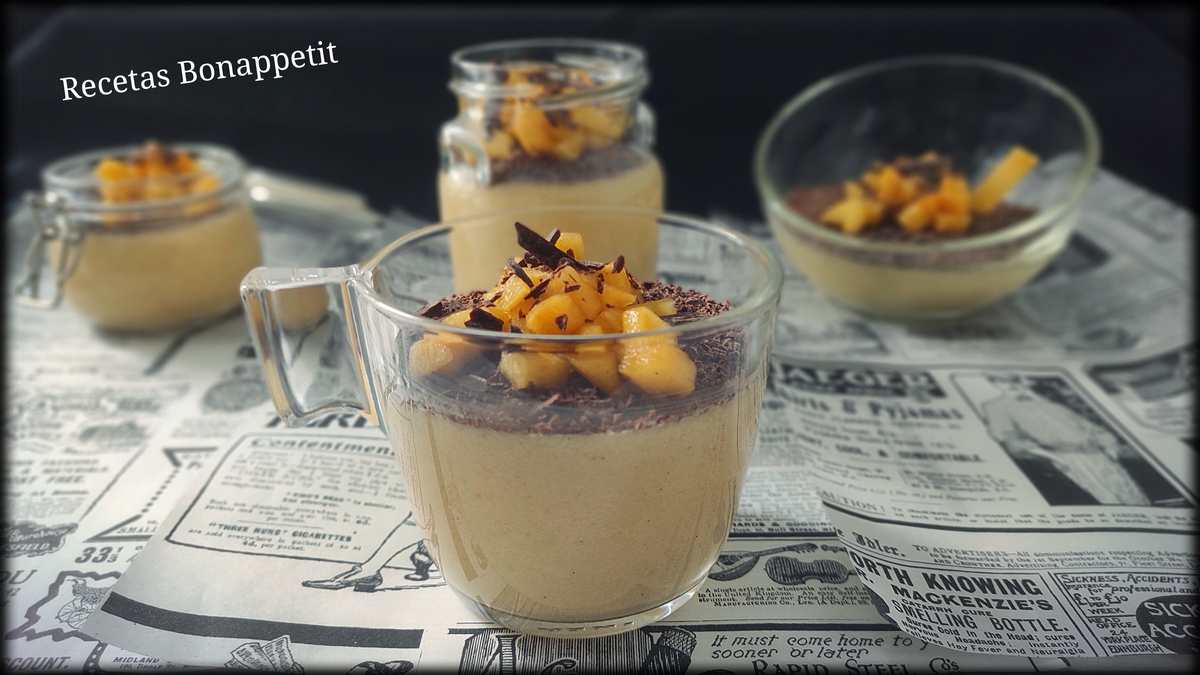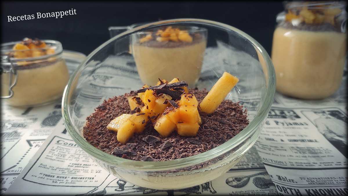 A la hora de servir sacamos de la nevera, rallamos chocolate sobre cada vaso de panna cotta y terminamos colocando unos daditos de caqui encima.