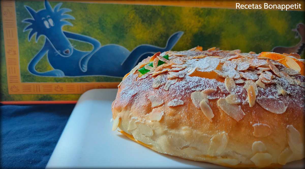 Después pintamos con huevo batido y decoramos con fruta escarchada, almendras y azúcar ligeramente humedecido con agua de azahar.